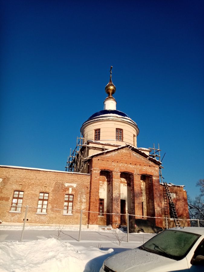 Декабрь 2021 года. Машина быстро мчится по трассе Киржач-Покров. Указатель показывает направление в село Знаменское. Проезжаем по главной улице села. Там впереди величаво возвышается храм. Синева купола отражается в окнах близ лежащих домов. Дорожки к храму прочищены. Машину ставлю напротив врат храма на стоянке. Кругом ослепительный белый снег. Многовековые липы застыли в морозной тишине. Вся эта неземная красота радует глаз.