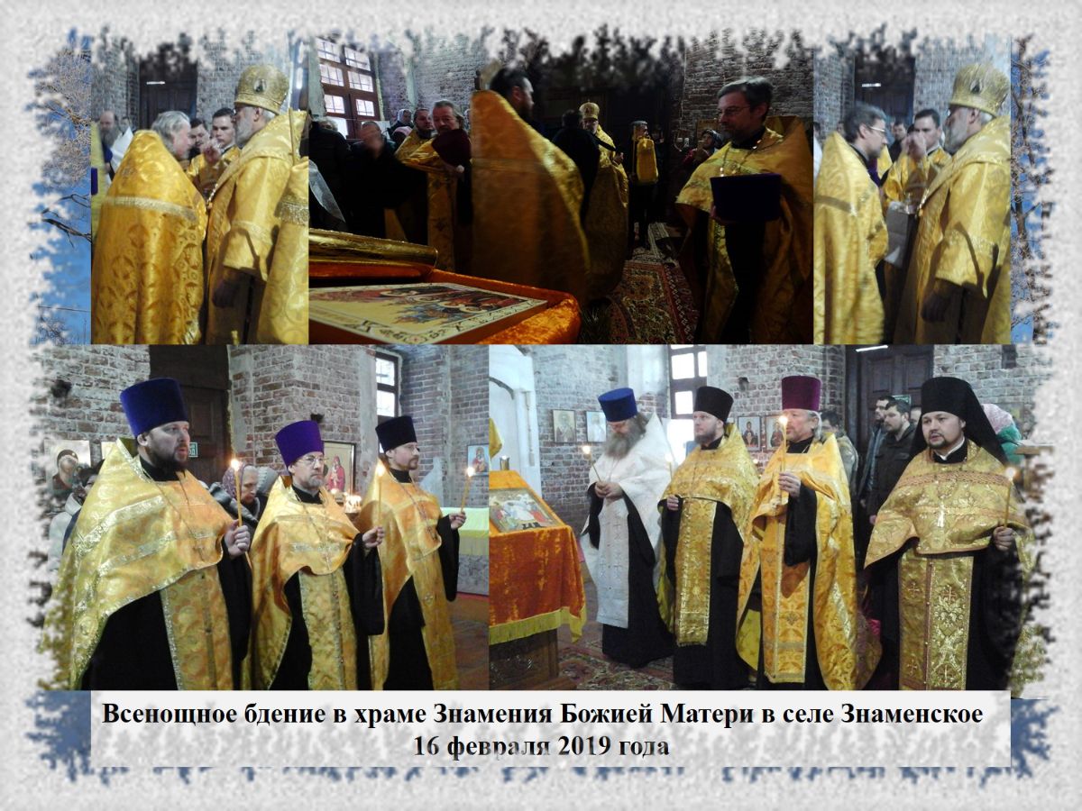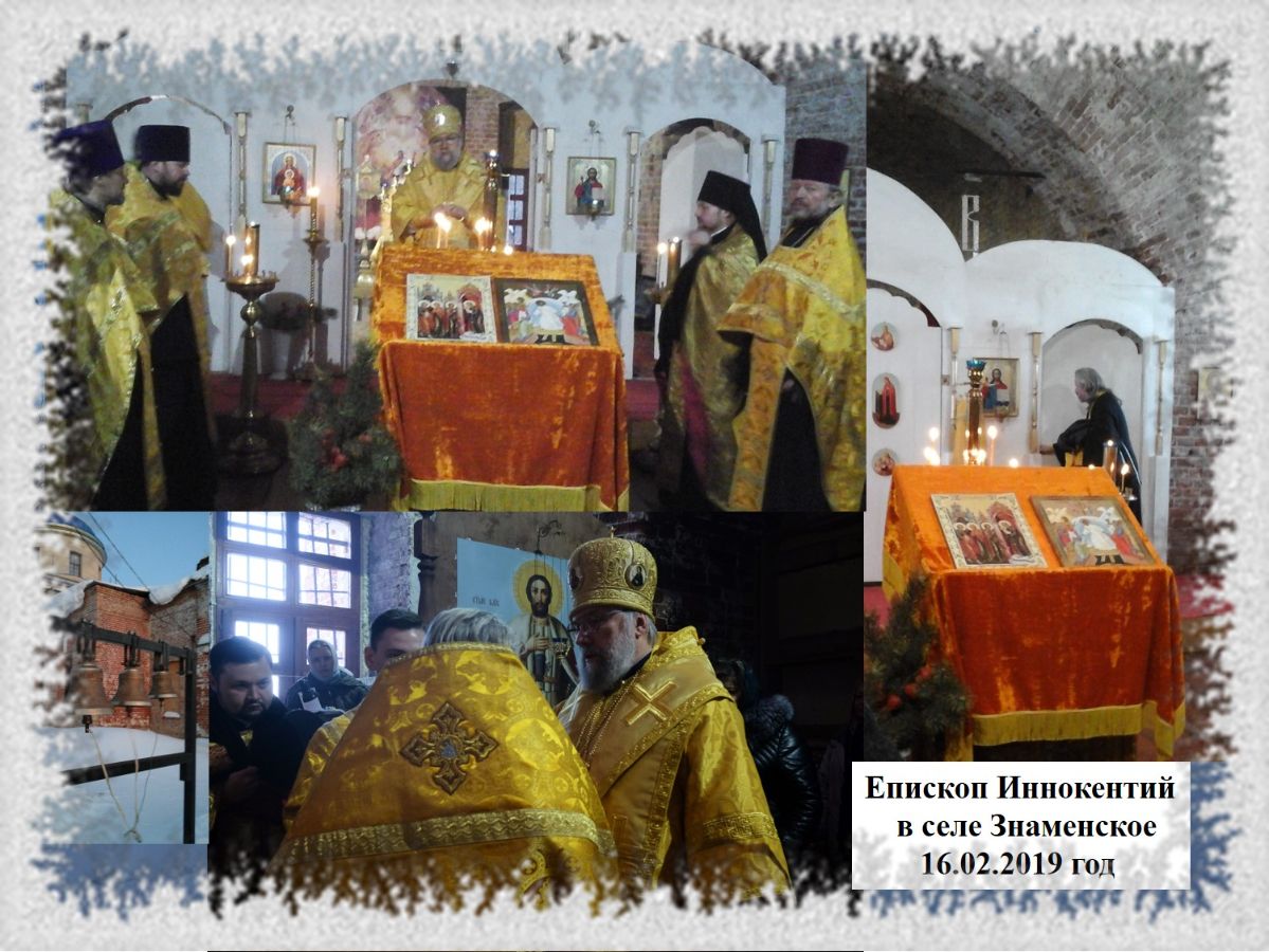 Епископ Иннокентий совершил Всенощное бдение в храме в честь иконы Божией Матери «Знамение» в селе Знаменское 16 февраля 2019 года, в субботу седмицы 38-й по Пятидесятнице, Преосвященный Иннокентий, епископ Александровский и Юрьев-Польский, совершил Всенощное бдение в храме в честь иконы Божией Матери «Знамение» в селе Знаменское Киржачского района. Его Преосвященству сослужили благочинный Киржачского церковного округа протоиерей Дмитрий Ершов и духовенство благочиния. По окончании Всенощного бдения, владыка Иннокентий совершил славление перед иконой Божией Матери «Знамение», после обратился к верующим со словом. https://al-eparhiya.ru/